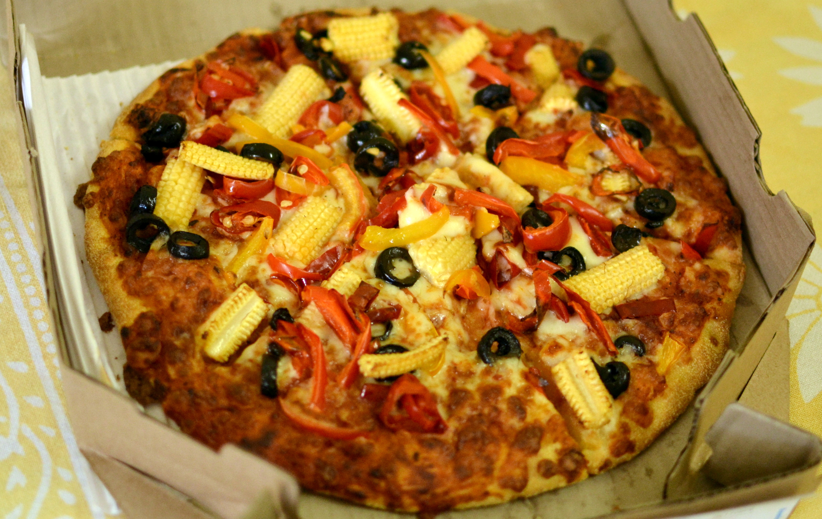 The exotic Roman Veg Supreme instantly transformed into ordinary with absence of the so called prime ingredient, Broccoli. This was compensated by red and yellow bell peppers. These pizzas come with what they call an Italian crust is a midway arrangement between the regular thick crust and a true thin crust.